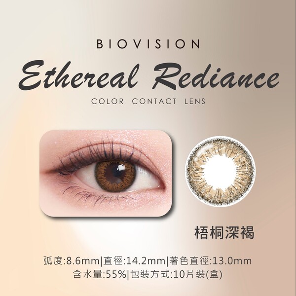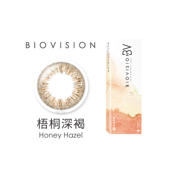 BioVision 碧維視織色彩色日拋10片裝梧桐深褐 週期類型 彩色日拋 含水量 55% 基弧 8.6mm 鏡片直徑 14.2mm 著色直徑 13.0mm 包裝 10片裝 字號 衛部醫器製字第008260號