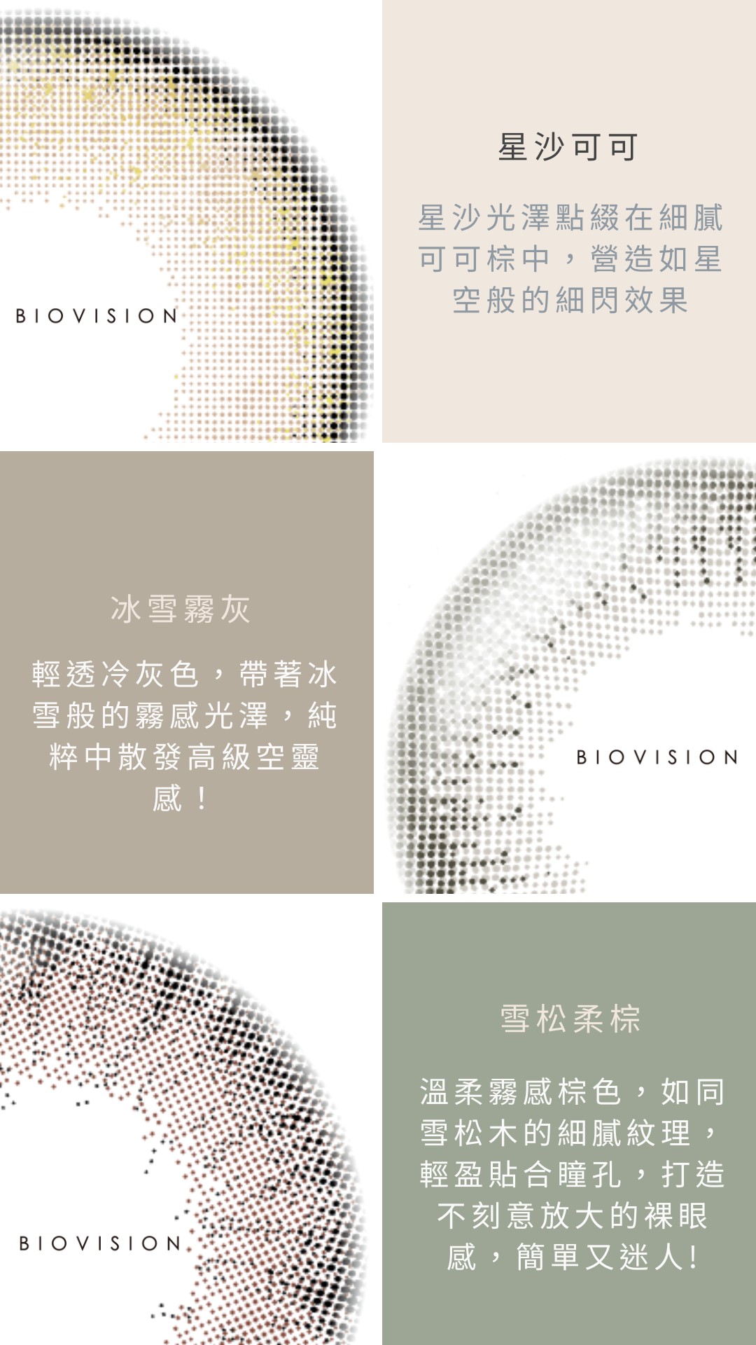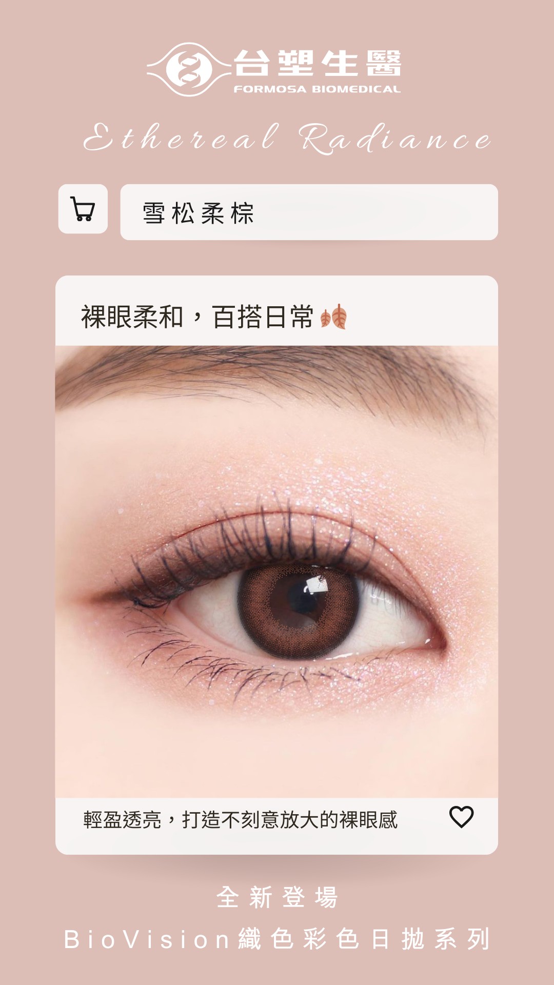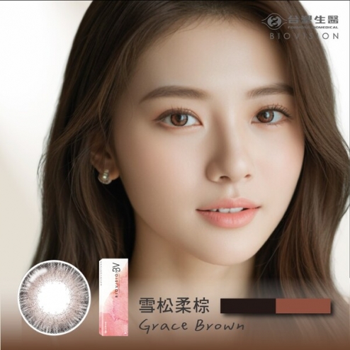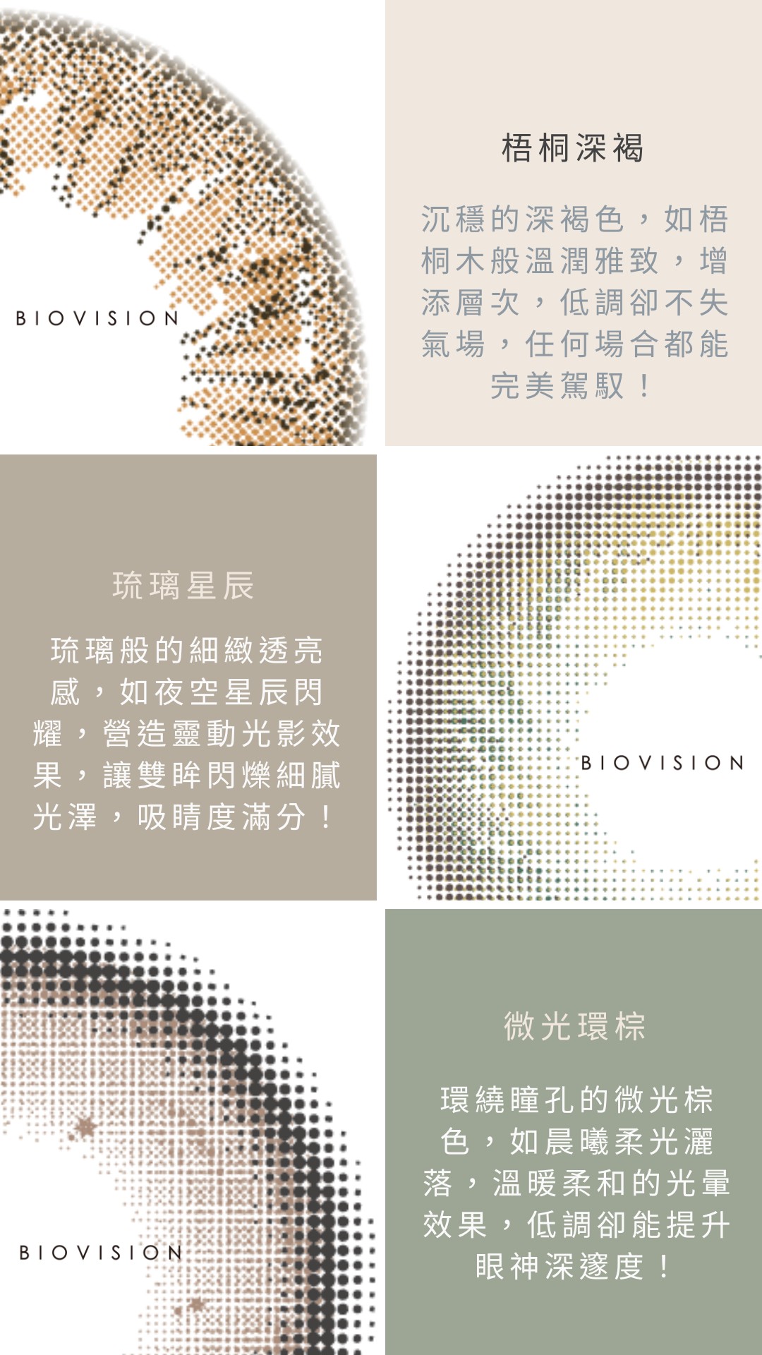 BioVision 碧維視織色彩色日拋10片裝雪松柔棕 週期類型 彩色日拋 含水量 55% 基弧 8.6mm 鏡片直徑 14.2mm 著色直徑 13.3mm 包裝 10片裝 字號 衛部醫器製字第008260號