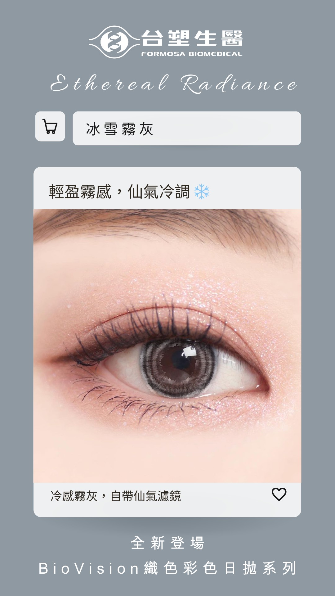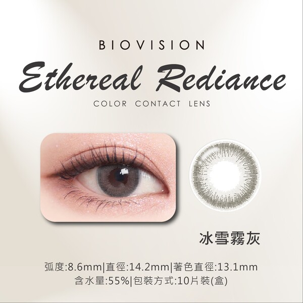 BioVision 碧維視織色彩色日拋10片裝冰雪霧灰 週期類型 彩色日拋 含水量 55% 基弧 8.6mm 鏡片直徑 14.2mm 著色直徑 13.1mm 包裝 10片裝 字號 衛部醫器製字第008260號