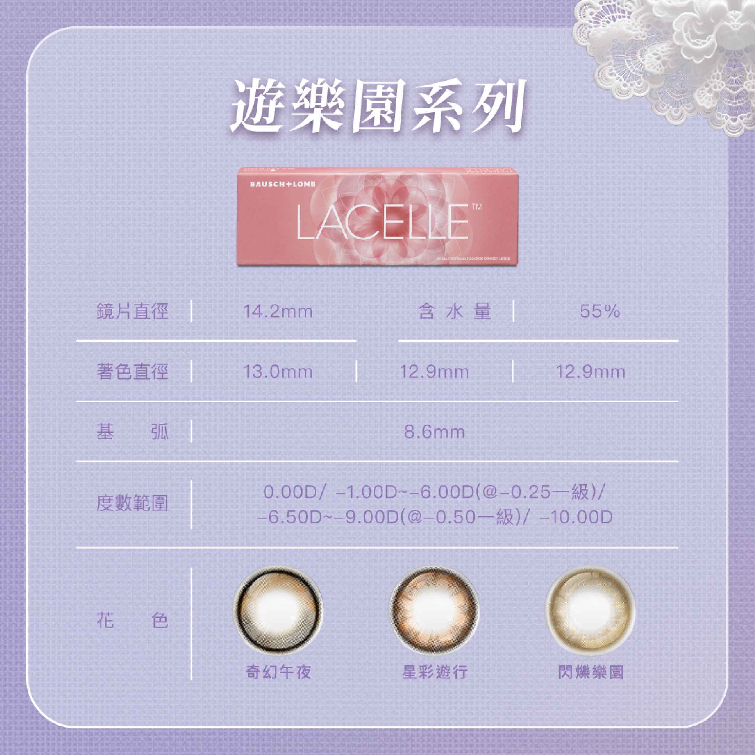 博士倫LACELLE遊遊樂園彩色日拋10片裝-閃爍樂園 Freedom Honey 週期類型 彩色日拋 含水量 55% 基弧 8.6mm 鏡片直徑 14.2mm 著色直徑 12.9mm 包裝 10片裝 字號 衛部醫器輸字第027875號