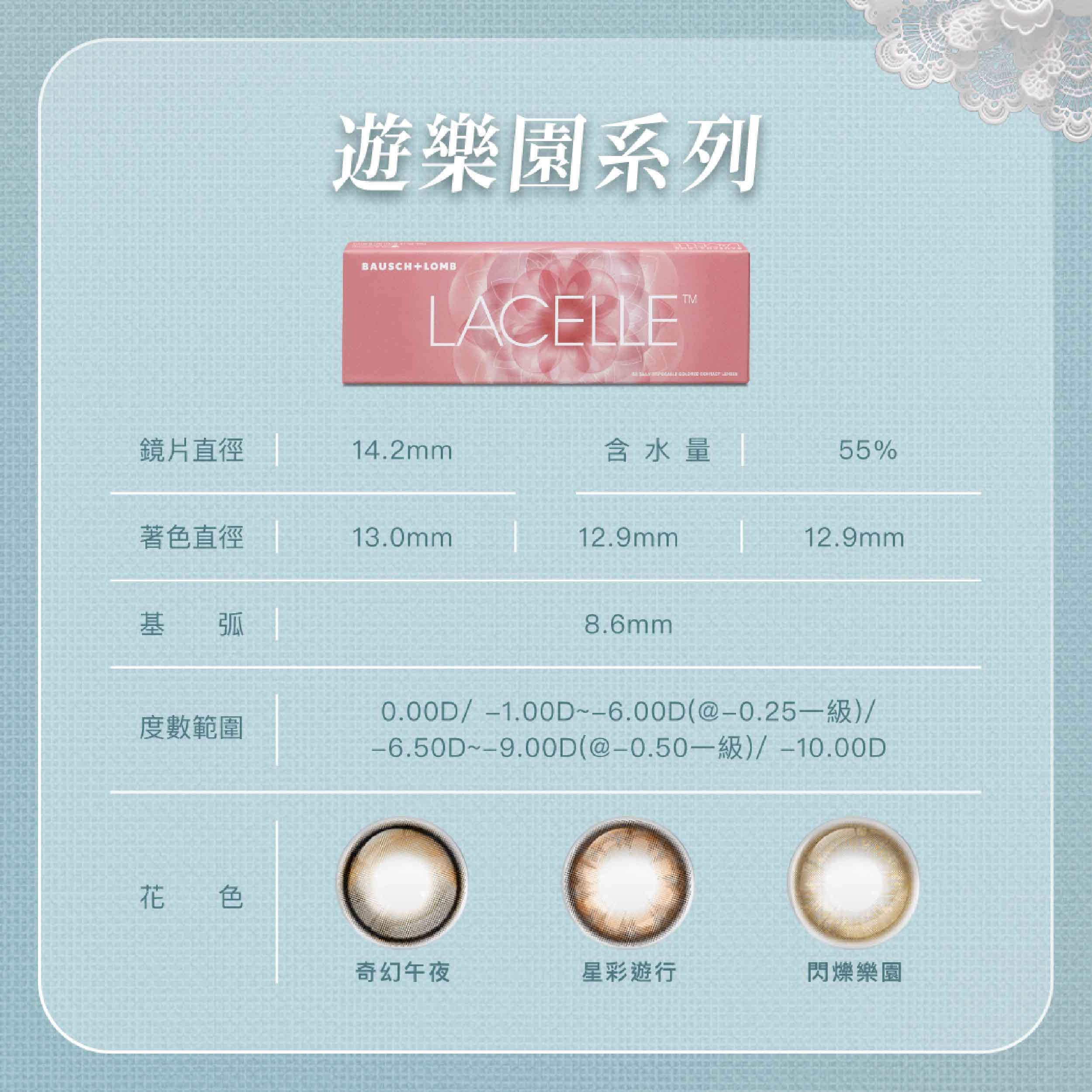 博士倫LACELLE遊樂園彩色日拋10片裝-奇幻午夜 Aurora Black 週期類型 彩色日拋 含水量 55% 基弧 8.6mm 鏡片直徑 14.2mm 著色直徑 13.0mm 包裝 10片裝 字號 衛部醫器輸字第027875號