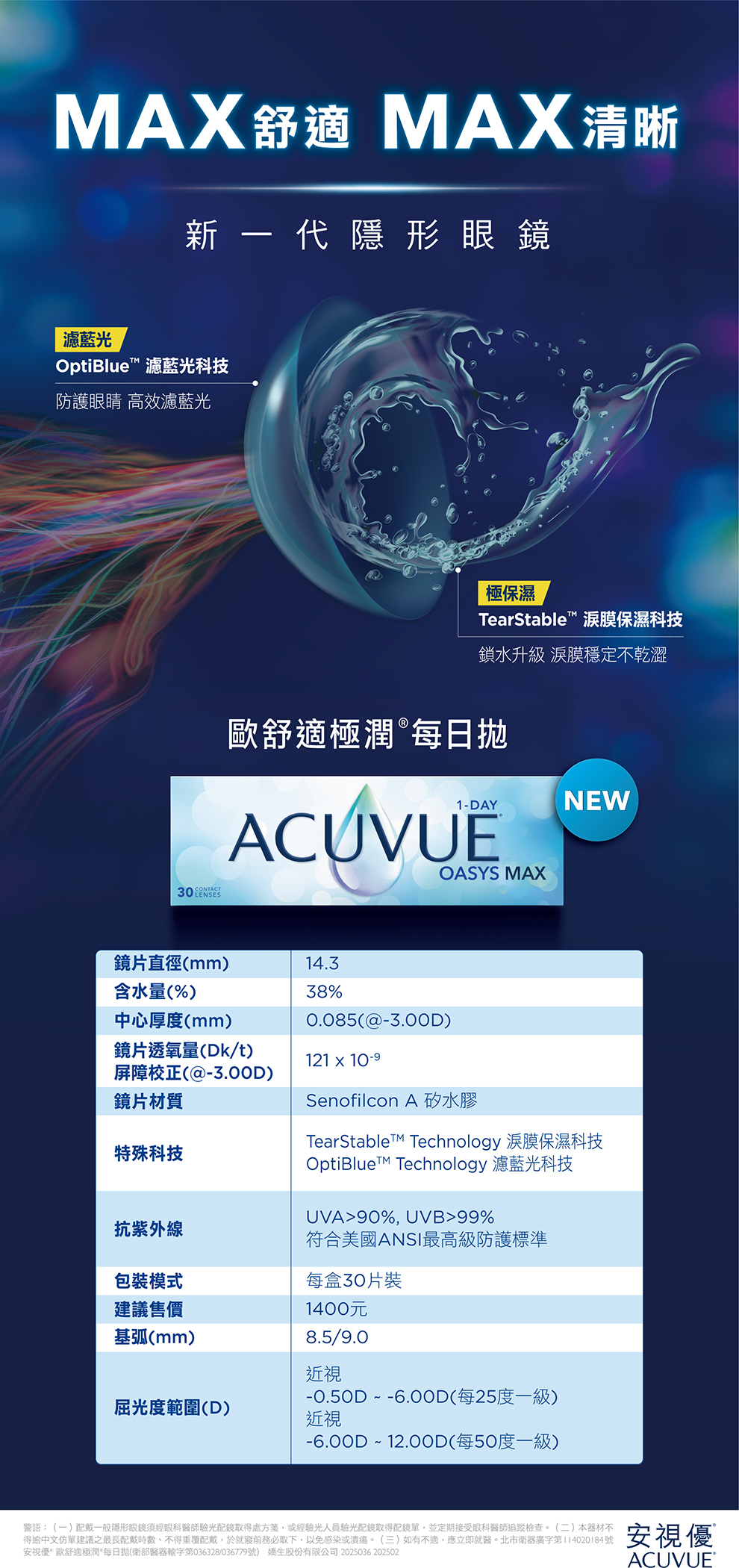 本產品規格 直徑:14.3 弧度:8.50/9.0 含水量:38% 包裝方式:30片裝 使用週期:日拋 許可證字號:衛部醫器輸字第036779號,衛部醫器輸字第036328號 產地:愛爾蘭 公司名稱:嬌生股份有限公司